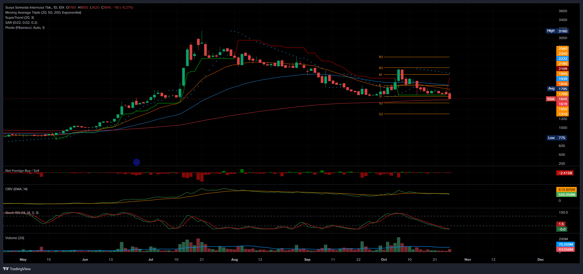 - Harga SSIA berada di area oversold ekstrem, sehingga peluang rebound teknikal jangka pendek cukup besar. Namun, jika 1.600 jebol dengan volume besar, potensi koreksi lanjutan ke 1.550 atau bahkan 1.310 perlu diwaspadai.