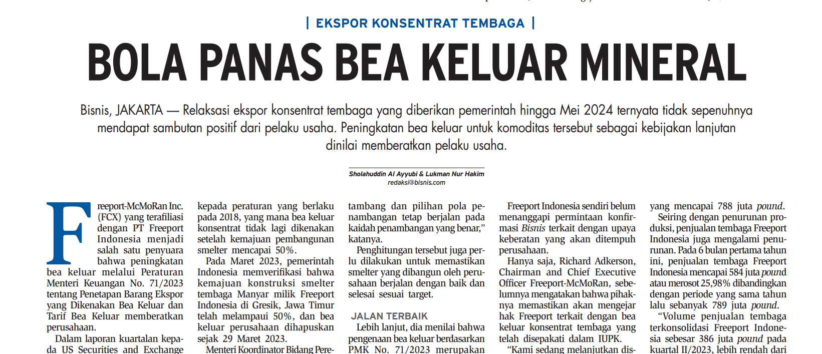 - Freeport-McMoRan Inc. (FCX) terafiliasi dengan PT Freeport Indonesia menyatakan bahwa peningkatan bea keluar melalui Peraturan Menteri Keuangan No. 71/2023 memberatkan perusahaan.