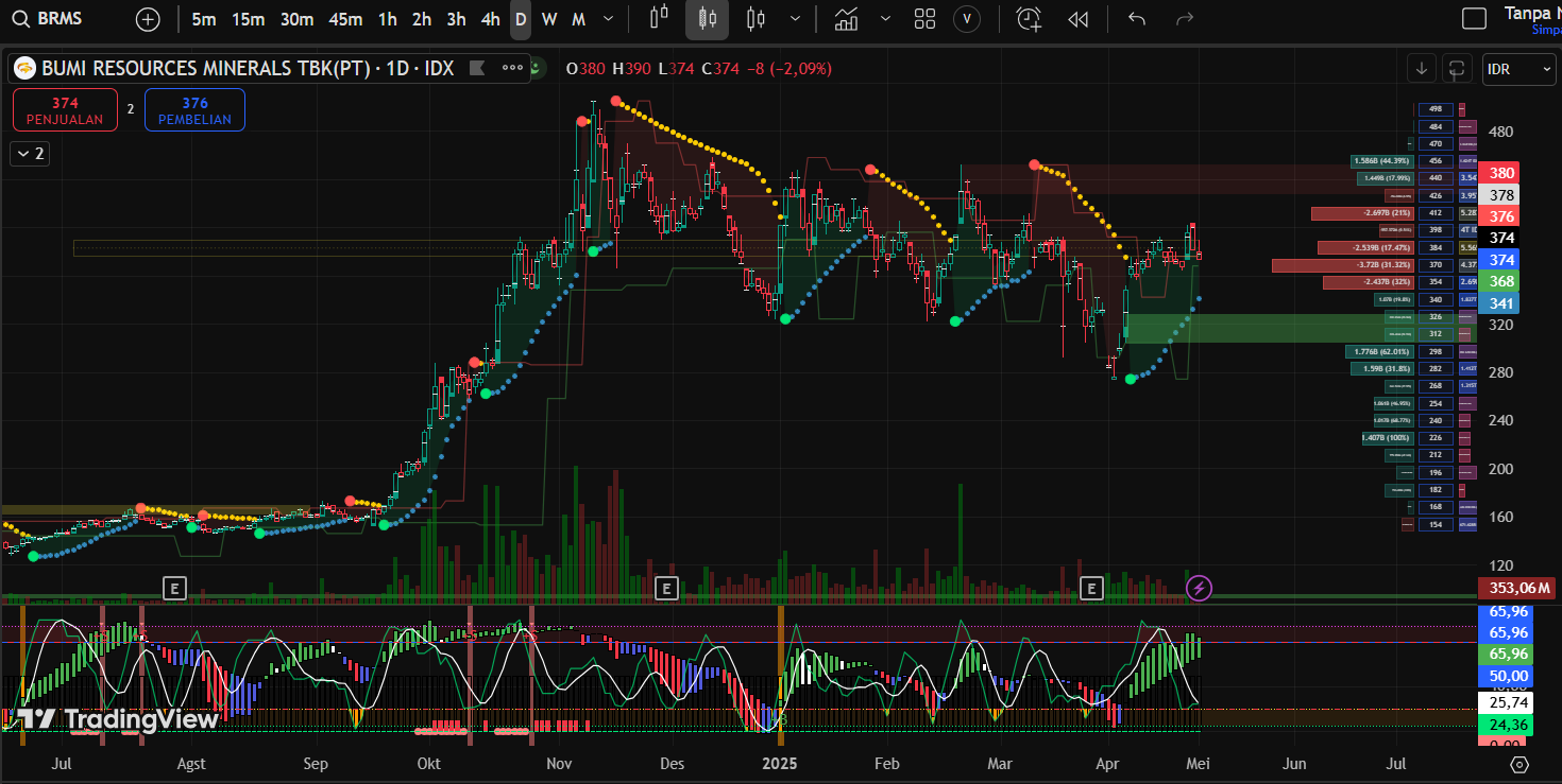 BRMS masih layak hold. ada demand baru di 302-330, belum ada distribusi ya gan. kalau belum masuk, tunggu koreksi lagi ya.
