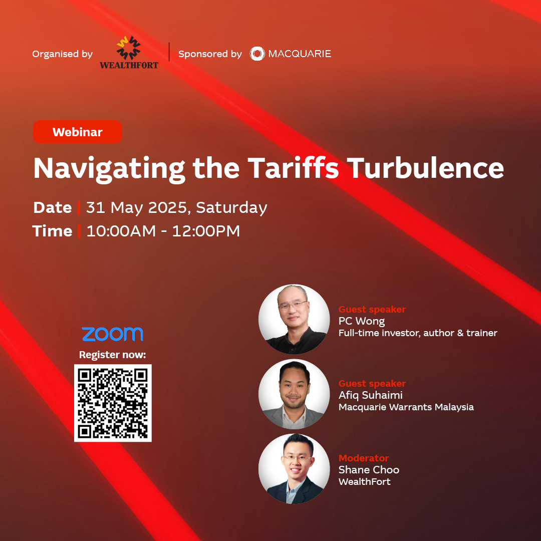 Join this webinar “Navigating the Tariffs Turbulence” to make sense of these macro changes and learn practical strategies to help you steer your investments to greater height. Our speaker, PC Wong, will share the impact of tariffs and the outlook on the US and gold market. Meanwhile, our second speaker from Macquarie Warrants Malaysia, Afiq Suhaimi, will show you how structured warrants can help you navigate this volatile market, be it bullish or bearish.