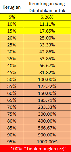 4. Perhatikan Tabel: Batasi kerugian di 10–20%, karena jika lebih dari itu, balik modal akan sangat sulit.
