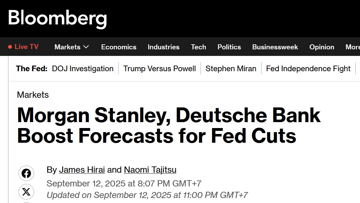 • Deutsche Bank: Sebelumnya mereka hanya memprediksi dua kali potong bunga di sisa tahun 2025. Sekarang, mereka menambah satu lagi, menjadi total tiga kali pemangkasan. Yaitu pada pertengahan Sept, akhir Oct, dan awal Des.