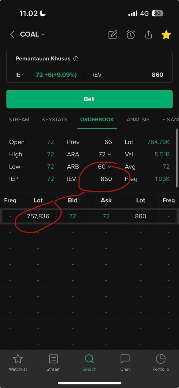 • IEP = 72: Ini berarti sistem telah menghitung bahwa harga yang paling mungkin terbentuk untuk saham ini pada sesi lelang berikutnya adalah Rp 72 per lembar saham.