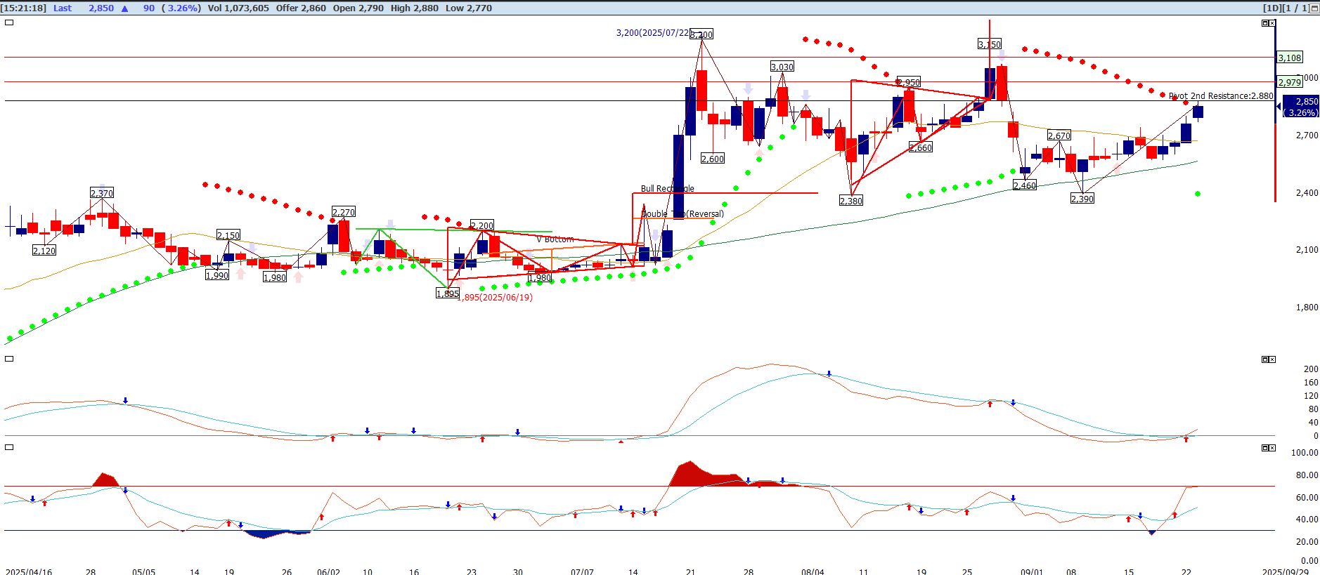 - Harga saat ini mendekati resistance pertama Rp2.903,00 dan support di Rp2.793,00; Bollinger band menunjukkan harga berada di kisaran atas.