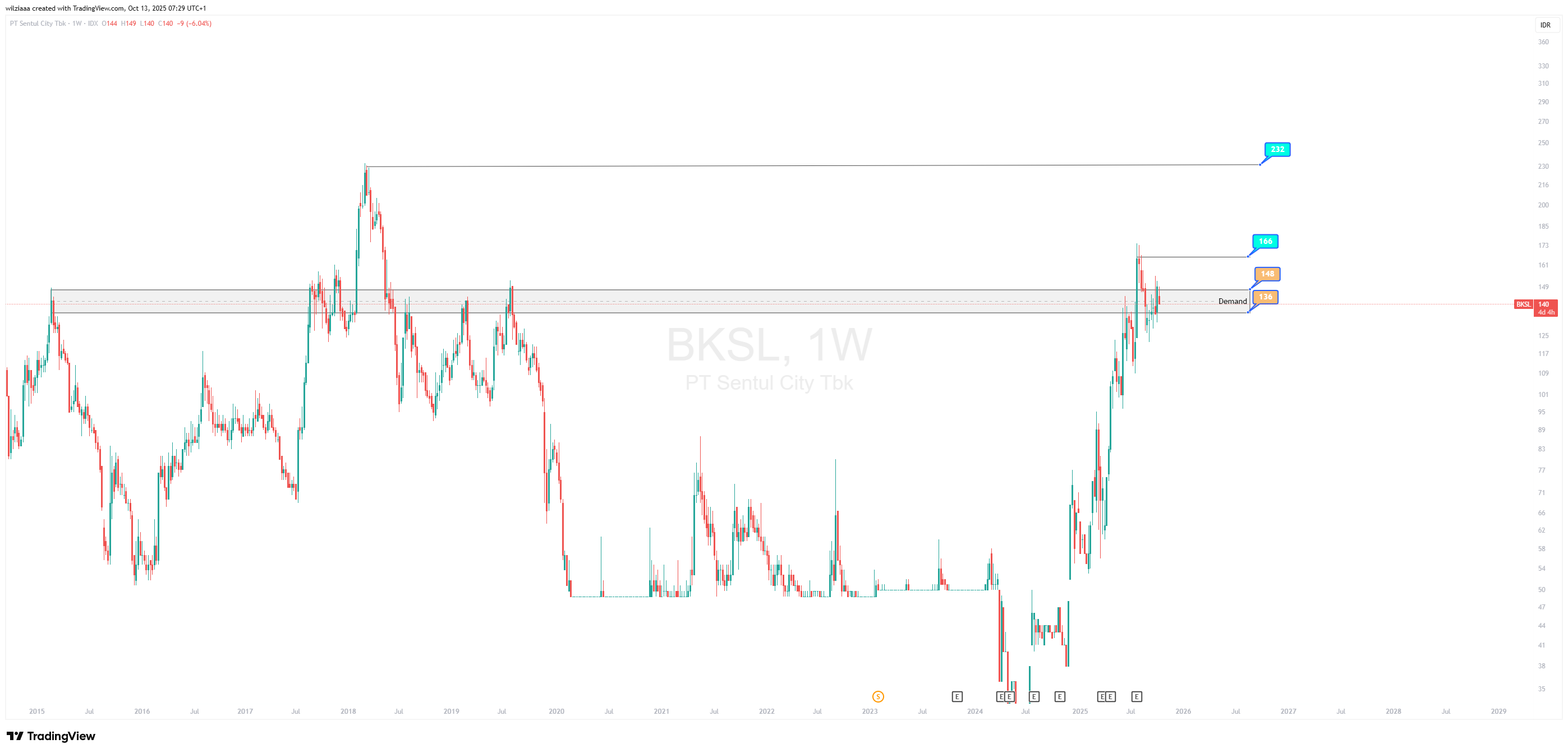 Harga BKSL saat ini sedang bergerak di area demand zone 136โ148, yang sebelumnya merupakan area resistance kuat di masa lalu dan kini berpotensi berubah fungsi menjadi support.