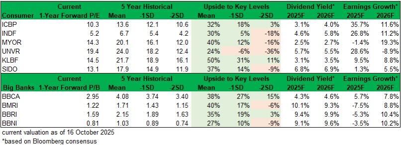 Secara fundamental, sektor consumer memiliki prospek pertumbuhan laba bersih yang relatif lebih baik pada 2025–2026F dibandingkan big banks, dengan $ICBP + $INDF dan $KLBF paling menonjol dari aspek ini. Sementara itu, big banks — kecuali BBCA — berpotensi mengalami penurunan laba pada 2025F sebelum pulih pada 2026F, tetapi hal ini dikompensasikan dengan prospek dividen (dividend yield) yang relatif lebih tinggi dibandingkan sektor consumer. Dalam jangka pendek, kami memperkirakan rilis kinerja 3Q25 secara umum berpotensi menjadi yang terendah (bottom) dan akan mulai pulih pada 4Q25.