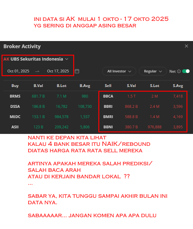 data asing contoh sample si AKapakah mereka beneran sell atau hanya kamuflase ?tunggu datanya sampai akhir bulan ini ya.kita cek sama samasaved saja data ini. siapa tau cocok.gak cocok, ya udah abaikan saja.$BMRI $BBNI $BBRI BBCA