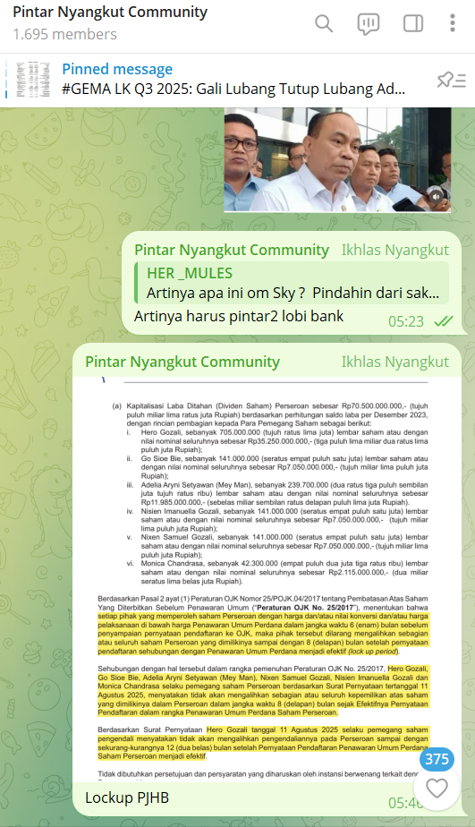 Pada kasus PJHB aturan lockup memang jelas. Ada dua kategori. Pertama untuk pemegang saham lama yang memperoleh saham dengan harga jauh di bawah harga penawaran IPO karena berasal dari kapitalisasi laba ditahan. Mereka ada enam orang dan seluruhnya terkait keluarga besar Gozali dan Tjandra. Aturan OJK mengharuskan mereka menahan saham selama 8 bulan setelah pernyataan pendaftaran menjadi efektif. Kedua untuk pemegang saham pengendali, Hero Gozali, yang wajib tidak mengalihkan pengendaliannya selama 12 bulan pasca efektif. Jadi dalam kata lain, sahamnya memang bisa diperjualbelikan lebih awal sesuai batas 8 bulan, tetapi pengendalian tidak boleh berubah sampai 12 bulan selesai. Upgrade Skill https://cutt.ly/Ve3nZHZf