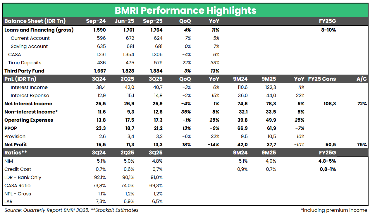 🏦 BMRI: Laba Bersih 9M25 (-10% YoY) Sejalan Ekspektasi, Indikasikan Pemulihan Kinerja pada 2026