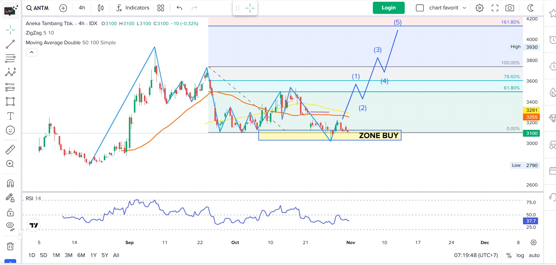 Indikator: ZigZag, MA50 & MA100, Fibonacci Retracement, RSI 14