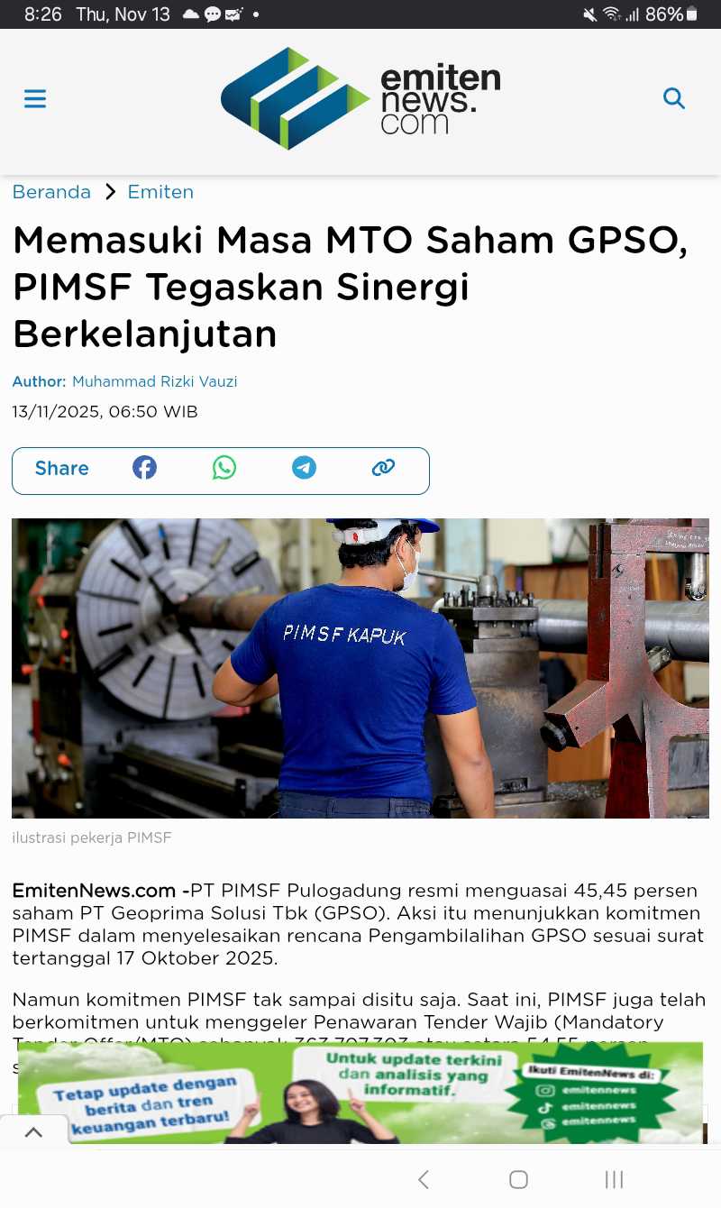 menyambung lagi sharing saya tentang cara membedakan real akusisi dan akusisi bohongan, beserta tahapan tahapan pada real akusisi: berita dibawah tentang emiten $GPSO, adalah tahap MTO (mandatory tender offer) yg dilakukan setelah tahapan akusisi selesai. MTO adalah suatu tahapan yg diwajibkan oleh OJK dalam pengambilalihan perusahaan terbuka. Setelah MTO selesai akan dilanjutkan dengan tahapan Rupslb, kemudian Right issue (inject asset) semoga bermanfaat. $MEJA $LAPD
