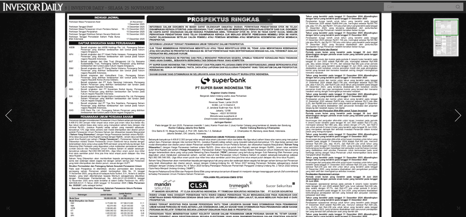 PT Super Bank Indonesia ($SUPA) resmi mengumumkan prospektus ringkas untuk IPO di koran Investor Daily dan website e–IPO pada Selasa (25/11), dengan kode emiten $SUPA. Dalam rencana ini, Superbank berencana menawarkan saham baru sebanyak ~4,4 miliar (13%) saham dengan harga penawaran berkisar 525–695 rupiah per lembar, yang mengimplikasikan perolehan dana berkisar 2,3–3,1 triliun rupiah. Perolehan dana dari aksi korporasi ini akan digunakan sebanyak 70% untuk modal kerja guna penyaluran kredit, sementara 30% sisanya untuk capex.