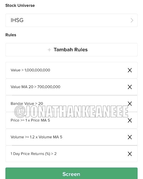 Screener ini nggak dibuat asal , setiap rule punya tujuan untuk memfilter saham menjadi semakin tajam sampai hanya tersisa saham yang punya momentum kuat + volume masuk + harga mulai naik stabil.