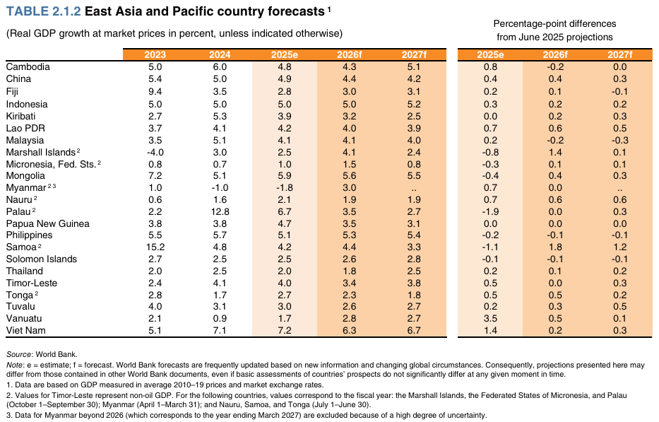 Bank Dunia merevisi naik prospek pertumbuhan ekonomi Indonesia pada periode 2025–2027 sekitar +0,2–0,3 percentage point dibandingkan proyeksi sebelumnya pada Juni 2025. Berikut rinciannya: