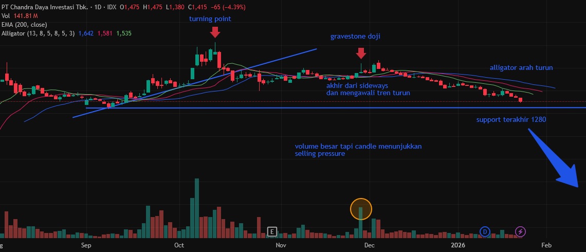 $CDIA terlihat masih lama untuk mencapai bottom dan ini jelas terlihat dari peta perjalanan sejak October 2025 lalu. Tanggal 13 Oktober 2025 menandakan turning point dan 17 Oktober mematahkan tren sideways dan mulai mengawali tren turun. Volume terbentuk stabil sampai hari ini kecuali 1 hari yaitu 27 Nov 2025 namun candle jelas menunjukkan selling pressure (gravestone doji, bentuk candle seperti salib terbalik) jadi ini bisa dikatakan konsistensi distribusi santai oleh big players dan ritel menampung dengan takut-takut makanya tidak terlalu terjadi volatilitas harga namun terus bertahap membentuk lower low (semakin hari tambah turun).