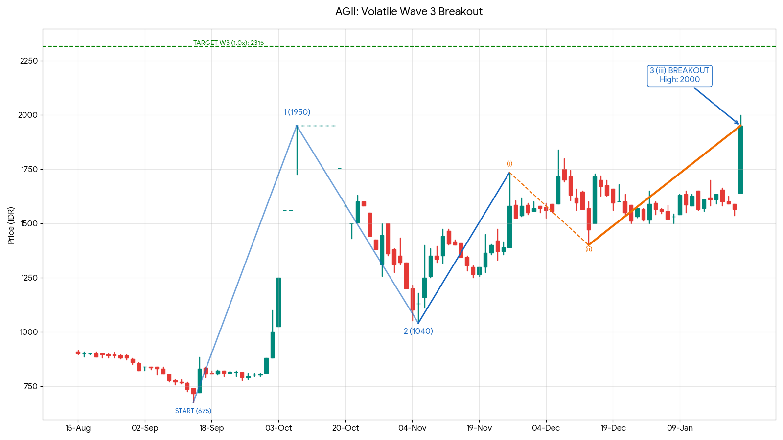 Sub-wave (iii) (Current): Harga saat ini di 1950-2000 sedang melakukan breakout dari Resistance 1950 (High Wave 1). Jika bertahan di atas level ini, target kenaikan berikutnya akan sangat tinggi (Blue Sky).