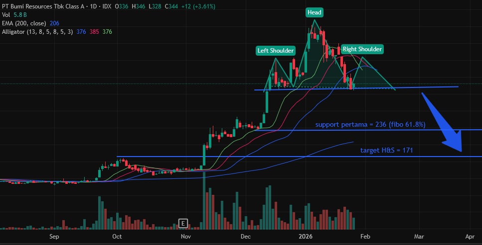 Pola ini batal apabila BUMI memang berhasil tembus 400 dan kembali bertahan ke level 450an namun melihat valuasi yang mahal, ritel yang masuk sangat banyak di harga atas, dan pengumuman MSCI, lebih besar potensi turun dan menembus support 326 (lowest 11 Dec 2025). Apabila ini terjadi, maka pattern terkonfirmasi dan potensi support pertama ada di 236 (atau range 200 - 250, ini juga berada pada level fibonacci 61.8%) dan support klimaks ada di 171 (atau downside sekitar 47% dari 326). Tentu untuk mencapai level ini tidak cepat dan bisa mengalami berbagai technical rebound namun selama tidak naik lagi di atas 326, maka target ini masih akan coba dicapai.