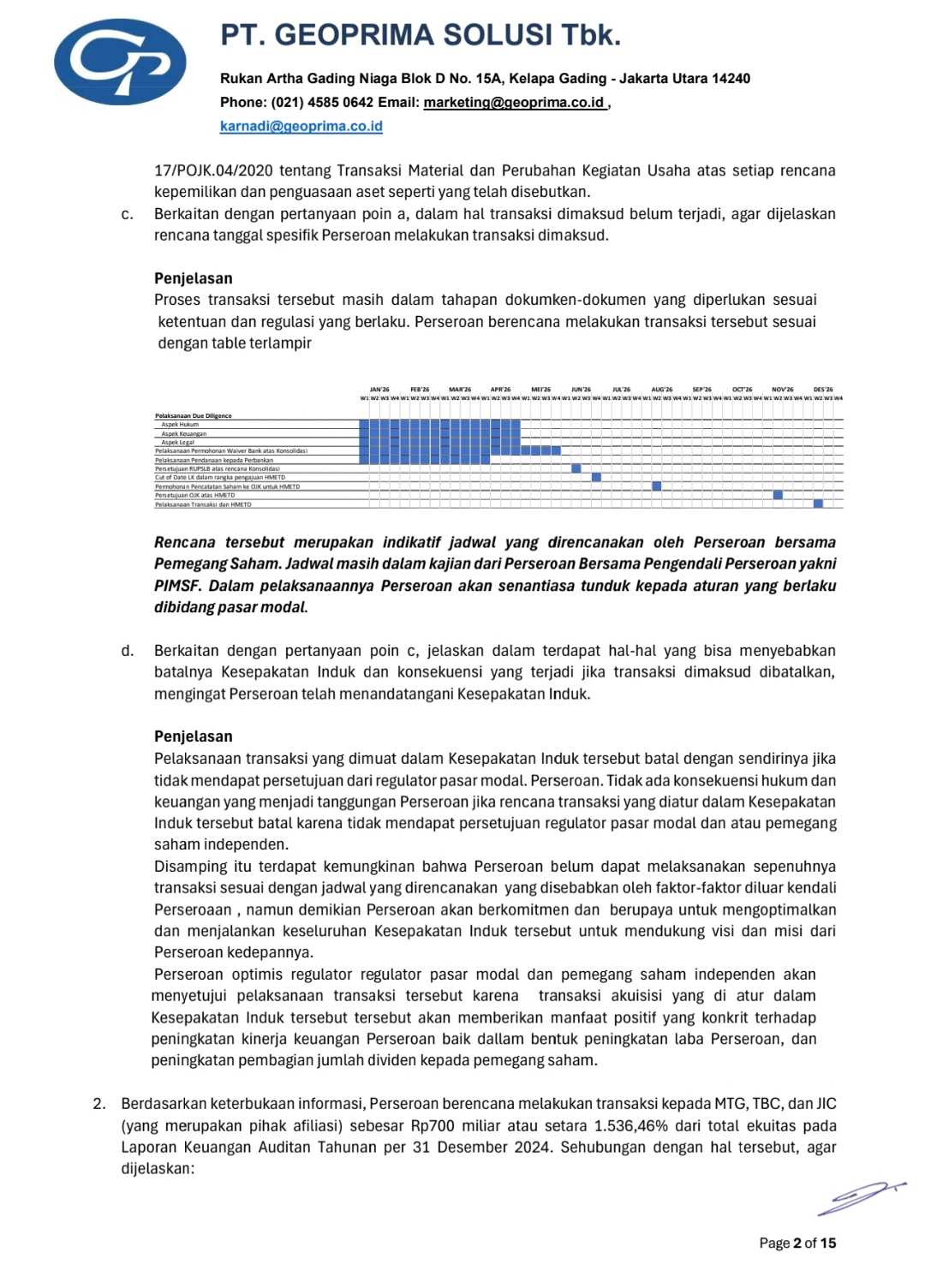 $GPSO PT Geoprima Solusi Tbk (GPSO) merencanakan Right Issue (PMHMETD) sebagai sumber pendanaan utama transaksi konsolidasi afiliasi dengan nilai indikatif Rp700 miliar (±1.536% dari ekuitas), yang bertujuan memperkuat struktur permodalan dan mendukung akuisisi hingga 99,9% atas entitas target; pelaksanaan masih indikatif dan bersyarat pada persetujuan RUPSLB, OJK, serta pemegang saham independen, dengan timeline 2026 meliputi due diligence (Jan–Mar), RUPSLB & struktur pendanaan (Mei–Jun), cut-off laporan keuangan & pengajuan HMETD ke OJK (Jun–Aug), persetujuan OJK (Aug–Sep), hingga eksekusi Right Issue dan transaksi (Sep–Okt), di mana manajemen menegaskan Right Issue ini tidak mengganggu kelangsungan usaha namun berpotensi menimbulkan dilusi bagi pemegang saham yang tidak mengeksekusi haknya.