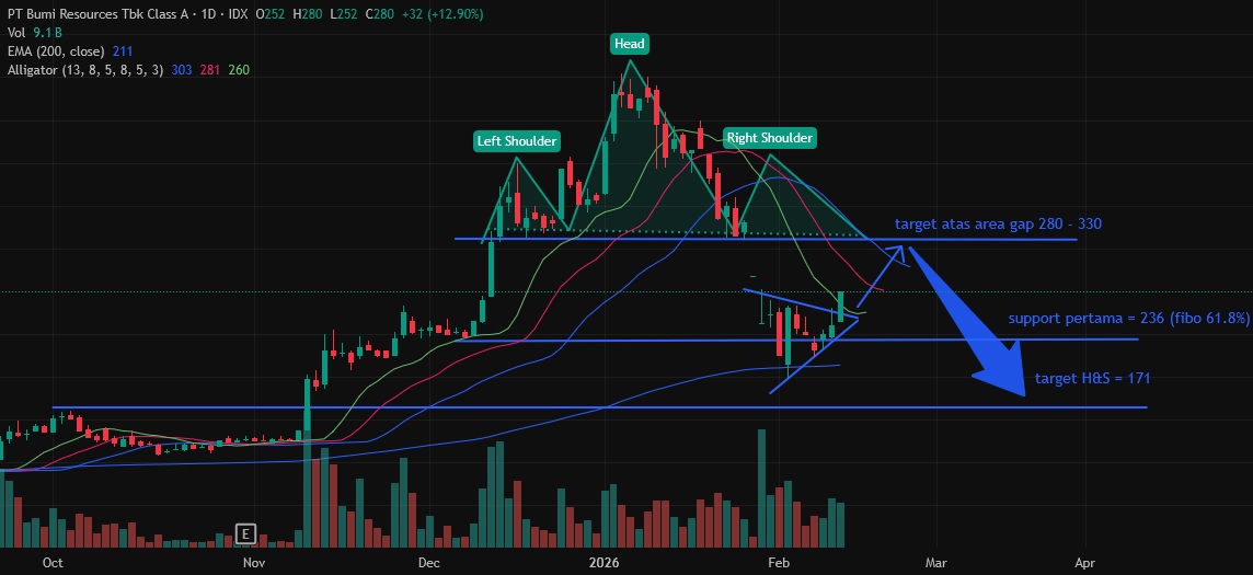 Terlampir chart agar lebih jelas untuk melihat awal dari pola H&S, breakdown, dan support kuat BUMI di sekitar 236 (titik fibonacci 61.8%) sehingga apabila minggu depan ternyata harga merosot di bawah ini, maka target 170 masih bisa terjadi. Saat ini terlihat broker summary sejak BUMI rebound pada tanggal 3 Feb 2026 lalu, institusi melalui broker YU terus melakukan distribusi masif sebesar 920 milyar. Apakah ini murni rebound untuk meningkatkan likuiditas sebelum melanjutkan distribusi atau memang penurunan telah selesai masih jadi pertanyaan.