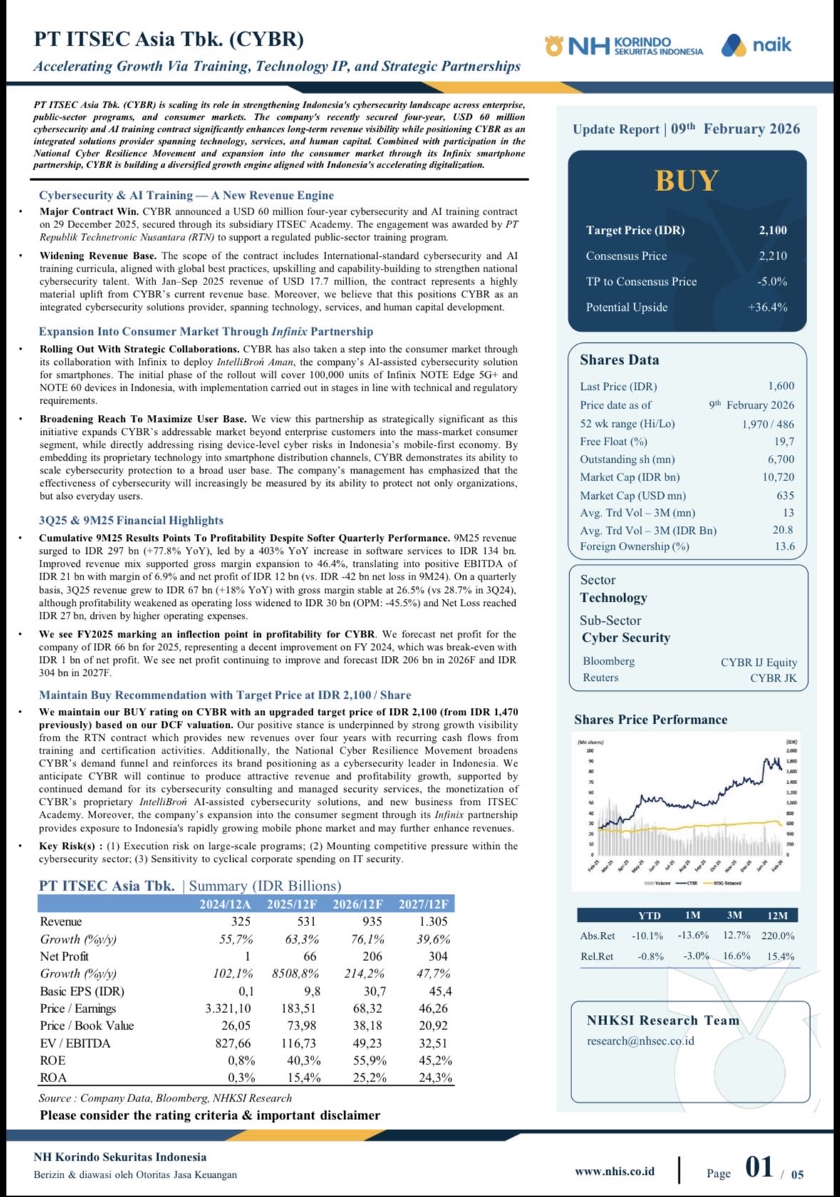 Tim Riset NH Korindo mempertahankan peringkat BELI untuk CYBR dengan Target Harga IDR 2.100 per saham, yang mewakili potensi kenaikan sebesar 31%.