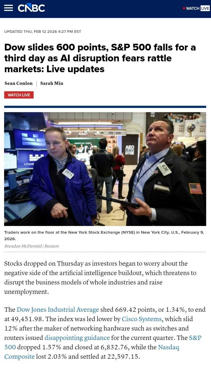 ➖ Pasar saham US mulai mengkhawatirkan disrupsi yang terjadi karena berkembangnya AI.Semua model bisnis existing saat ini terganggu dan akan menimbulkan banyak pengangguran.https://cutt.ly/atn2iBxy$IHSG $USDIDR $DOW30