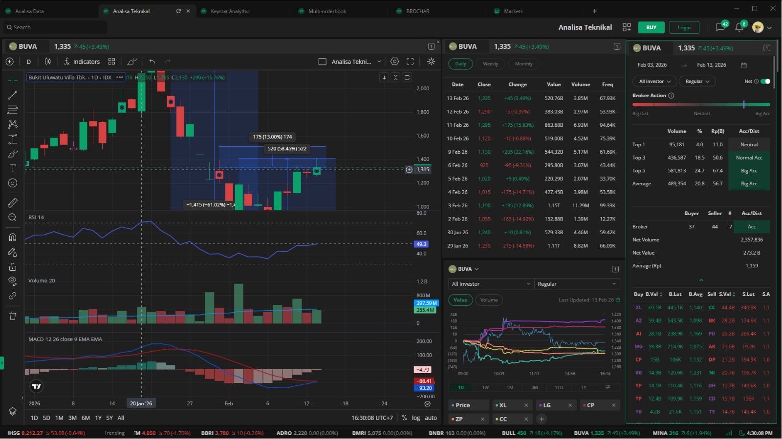 Sejauh ini BUVA telah mengalami Tren Bearish yang cukup Massive dimana dari HH ke HL sendiri terjadi koreksi sebesar 61.02% pasca terjadinya Crash pada IHSG akibat pembekuan oleh MSCI, namun disatu sisi BUVA berhasil bangkit dari keterpurukannya sekitar 59% dari titik The Lowest sd The Highest diakhir sesi pada haru Jumat 13 Februari 2026.