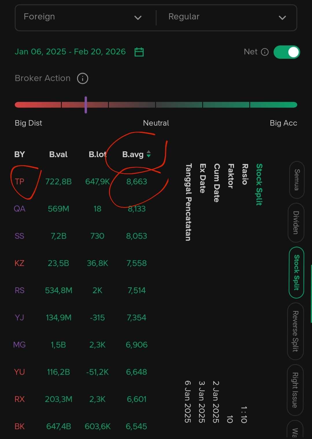 - Periode data: Setelah stock split 06 Januari 2025 - 20 Februari 2026
