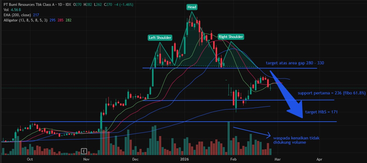 1. Recovery rally yang terjadi tidak didukung dengan volume masif. Terlampir di chart terlihat pada waktu naik, tidak ada lonjakan volume besar sedangkan volume besar yang terjadi di 29 Jan 2026 yang lalu adalah murni seller yang mendominasi makanya harga kemudian turun ke 198 beberapa hari kemudian.