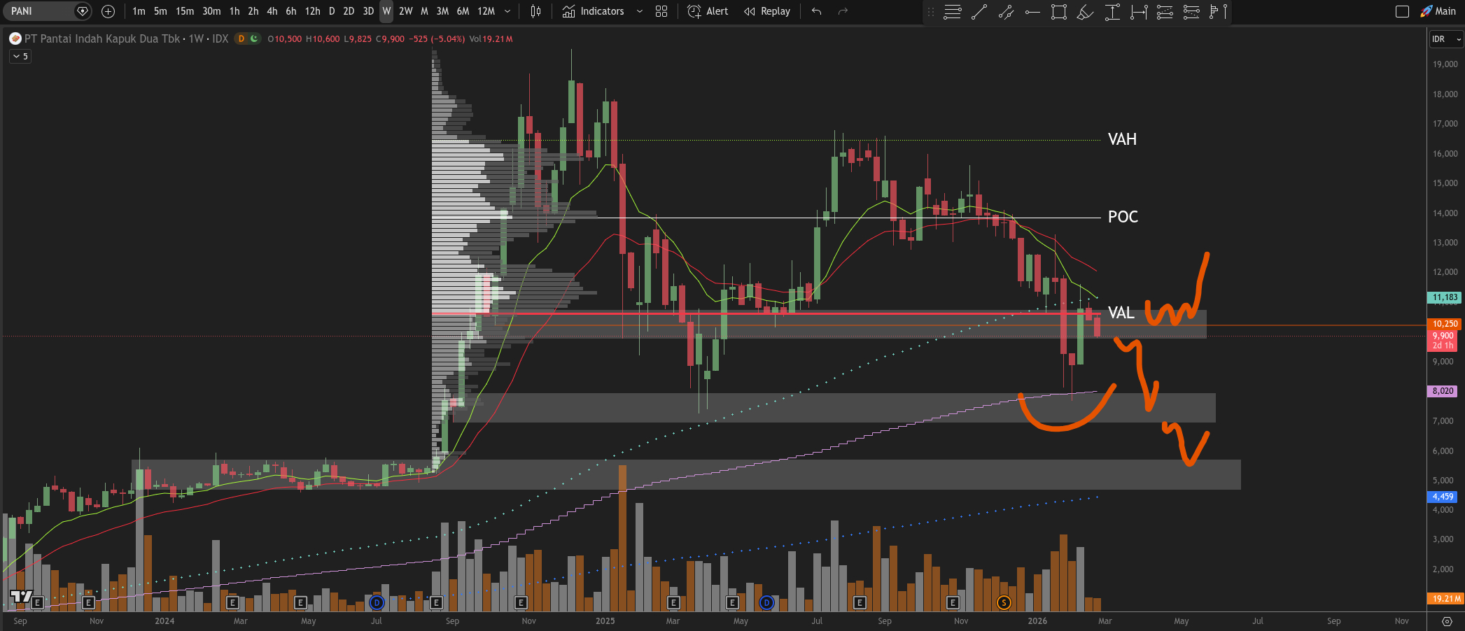 Sekadar mengingatkan, pani saat ini reject di VAL (value area low) atau tidak bisa reclaim VAL hingga ke POC (point of control) di indikator volume profile. Saya tarik vp dari tanggal 19 Aug 2024 hingga hariini.