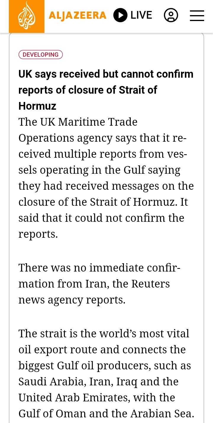 ❌ Ada laporan Selat Hormuz ditutup, walaupun belum bisa terkonfirmasihttps://cutt.ly/6tEcG9jl$BMRI $RATU $ELSA