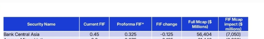 Berdasarkan riset MSCI, terdapat potensi penurunan Free Float Inclusion Factor (FIF) sebesar -12,5% pada Bank Central Asia Tbk