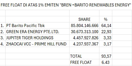 $BREN pantes harga nya gampang di kerek ke atas buat masuk MSCI ... Kalo kata saya sih mendingan BUBAR grakkk , ketentuan FF MSCI 15% , bren hanya 6.43% menurut data keterbukaan FF BEI , jadi BREN harus guyurrrr 8% ke publik jika tidak ingin terdepak dari MSCI, 8% itu jumlah yg sangat banyak dan pasti bikin rontok harga nya