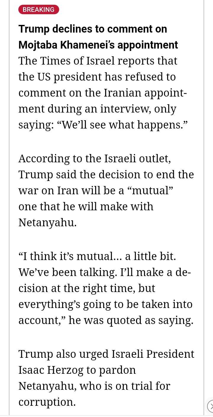 ❌ Trump belum mau berkomentar mengenai terpilihnya Mojtaba Khamenei sebagai supreme leader Iran yang baru.Mungkin US jadi ragu mengenai cara terbaik untuk menyelesaikan perang dengan cepat.https://cutt.ly/NtTfK6un$IHSG $OIL $USDIDR