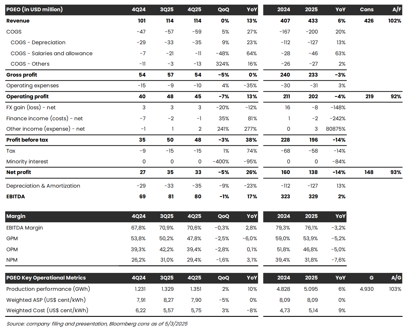 Secara operasional, produksi listrik tumbuh +6% YoY menjadi 5.095 GWh selama 2025, melampaui guidance 2025 dari manajemen yang telah direvisi naik menjadi 4.930 GWh. Sementara itu, tarif rata–rata tertimbang (weighted average tariff) relatif flat di level US$8,09 sen/kWh.