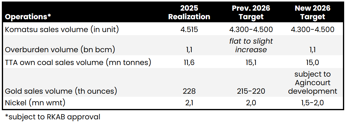 Manajemen United Tractors ($UNTR) dalam earnings call 2025 pada Selasa (10/3) kembali mempertahankan target operasional untuk 2026, kecuali untuk segmen emas (lihat tabel). Sebagai catatan, realisasi atas guidance 2026 ini bergantung pada persetujuan kuota RKAB batu bara perseroan dan klien. Adapun guidance capex UNTR pada 2026 mencapai US$800 juta (vs. realisasi 2025: ~US$900 juta).