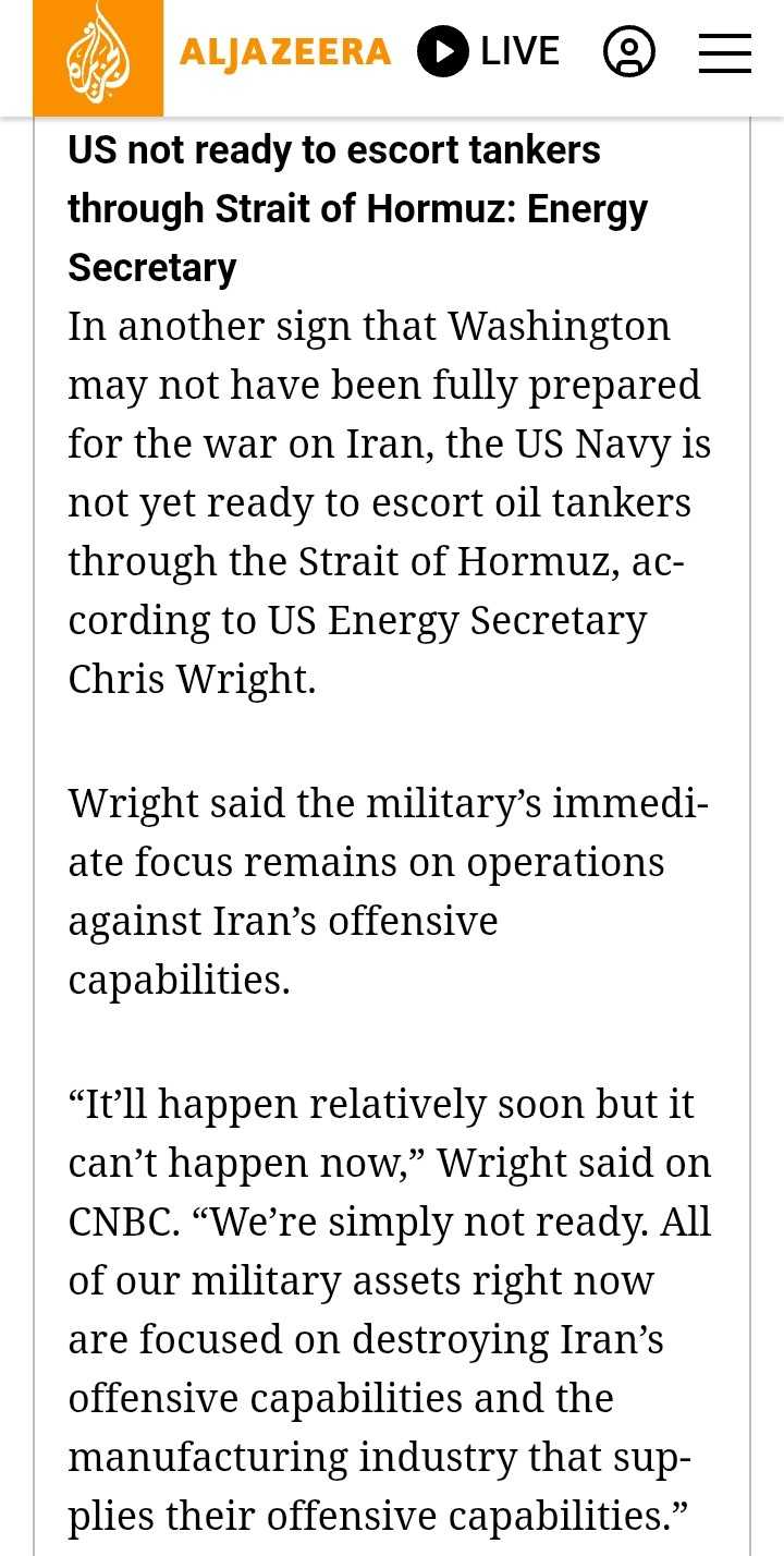 ❌ US belum siap melakukan pengawalan kapal di Selat Hormuz.https://cutt.ly/dtYo00AQMenjadi sinyal bahwa US tidak begitu siap menghadapi daya tahan Iran dalam perang ini.$BRENT $OIL $ELSA