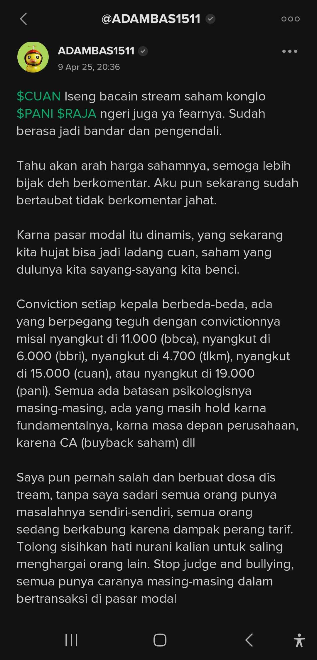 @RickyTsia hahaha tiap adam now muncul di $AADI dgn kata2 beringasnya kita ksh ss nasihat adam jadul aja biar adem 😅