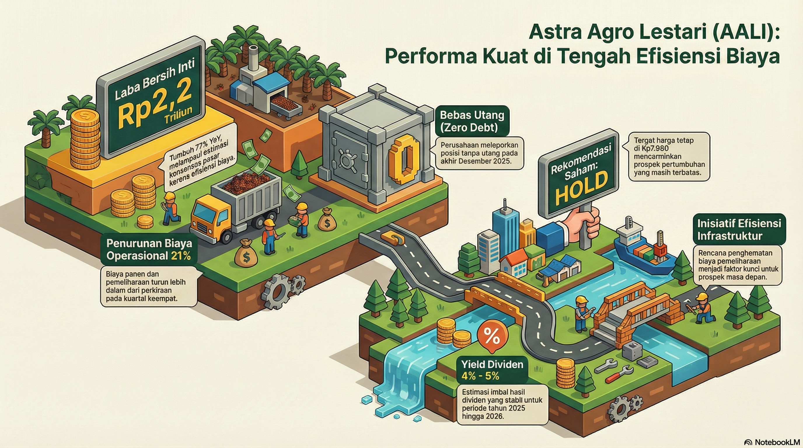 • Struktur Modal yang Kuat: Per Desember 2025, AALI melaporkan posisi tanpa utang (zero debt), yang merupakan peningkatan signifikan dibandingkan tahun-tahun sebelumnya.