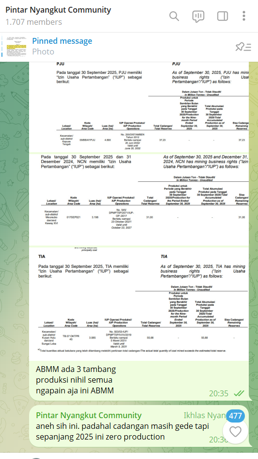 ABMM memang sangat bergantung pada $GEMS, tapi ABMM sebenarnya punya tambang sendiri juga. Di atas kertas, grup ini kelihatan seperti pemilik tambang batubara yang serius, dengan tiga IUP operasi produksi yang tersebar di Tanah Bumbu Kalimantan Selatan, Aceh Barat, dan Kapuas Tengah. Total cadangan yang tercatat mencapai sekitar 123,91 juta ton pada 30 September 2025, angka yang secara teori bisa menopang umur tambang yang sangat panjang. Namun ketika laporan produksinya dibuka, kenyataannya jauh lebih dingin. Untuk periode sembilan bulan pertama 2025, produksi batubara dari tambang milik sendiri tercatat nihil. Yang berputar justru bukan alat gali di tambang sendiri, tetapi mesin jasa kontraktor tambang dan logistik yang mengerjakan tambang milik pihak lain serta laba dari entitas asosiasi seperti GEMS yang masih rajin mencetak laba. Upgrade Skill https://cutt.ly/Ve3nZHZf