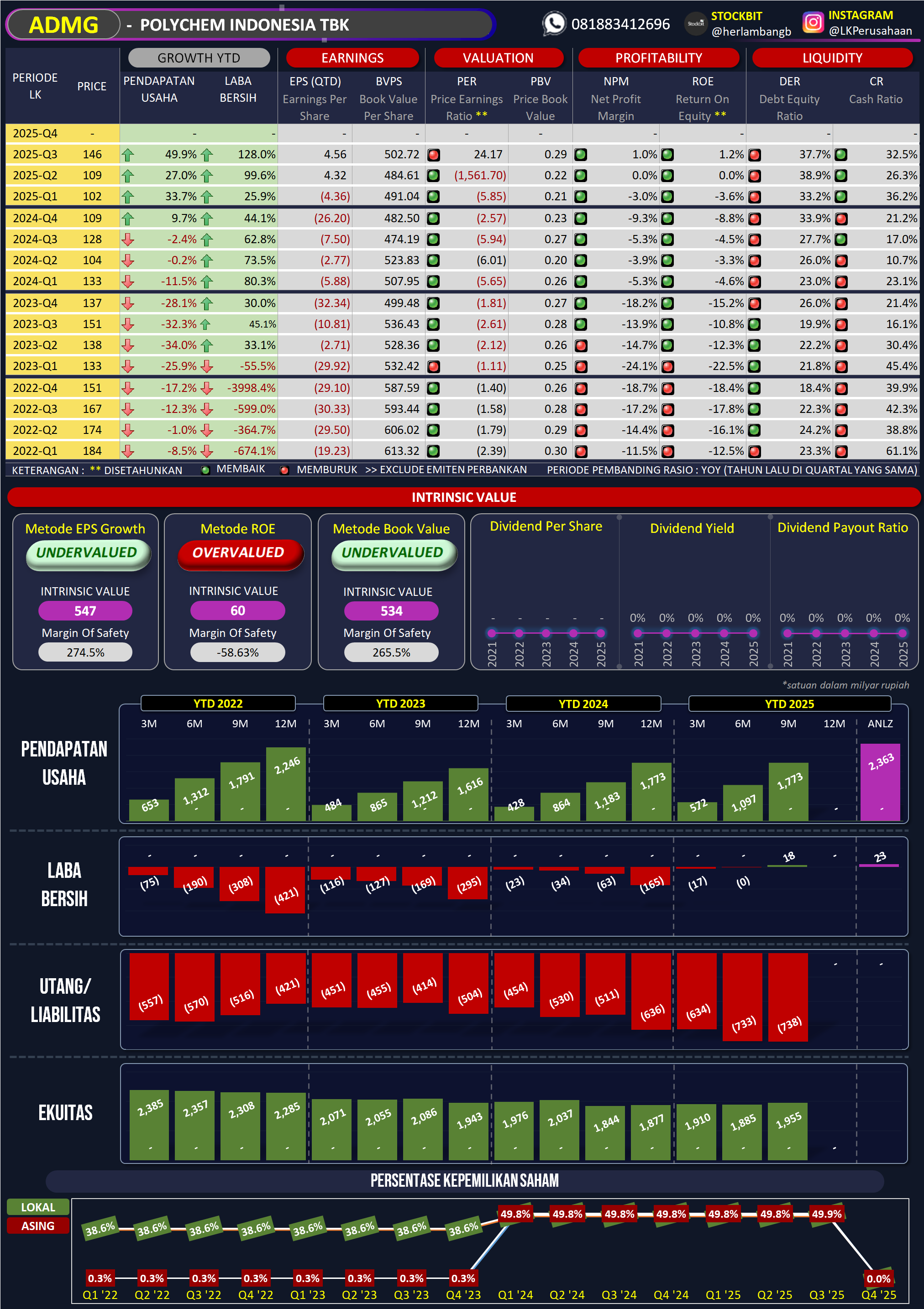 $ADMG akhirnya keluar juga laporannya , kalau per kuartal bisa menghasilkan 17 milyar , setahun berarti 68 milyar. maka saham ini diperdagangkan pada per sekitar 8 dengan harga saham 150 perak