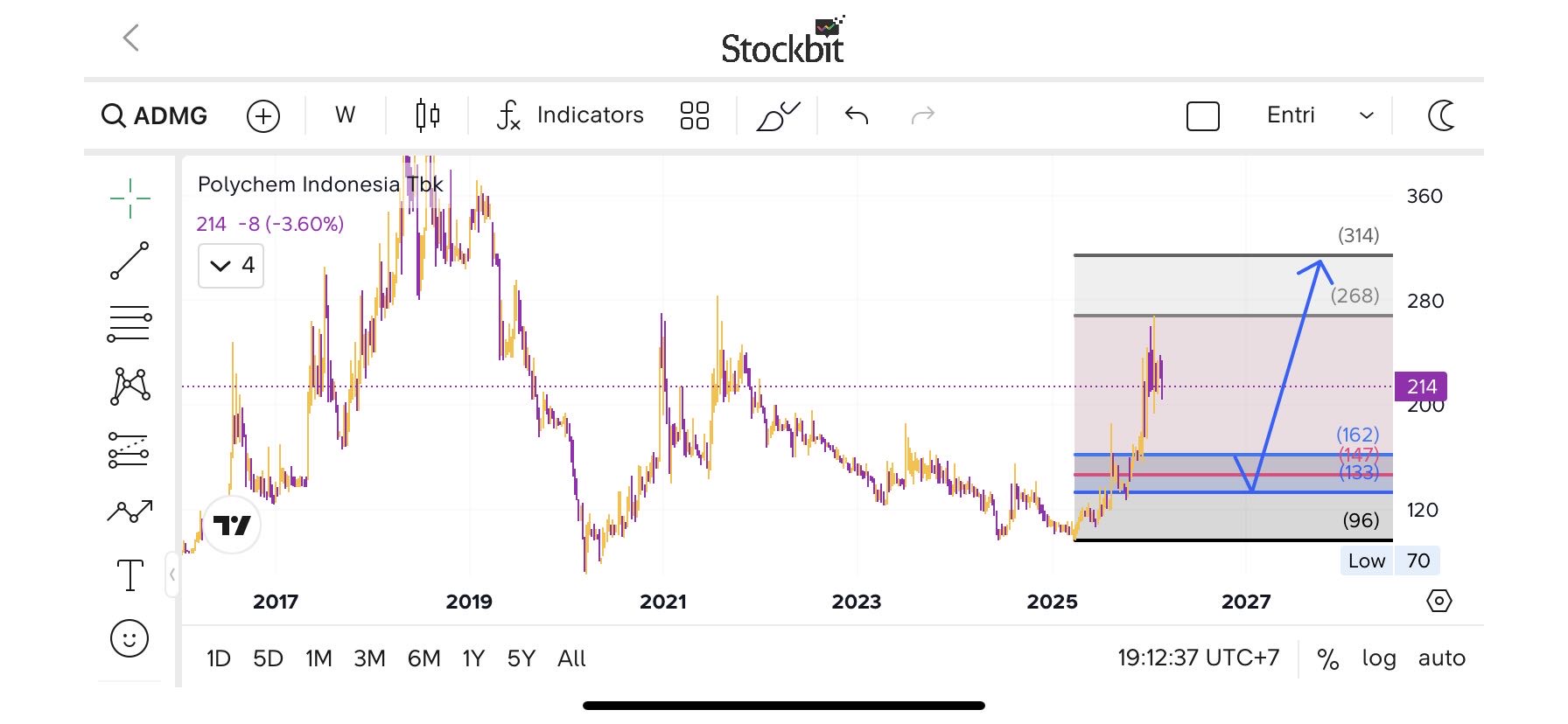 - Entry: Buy kalau breakout > 185 dengan volume besar