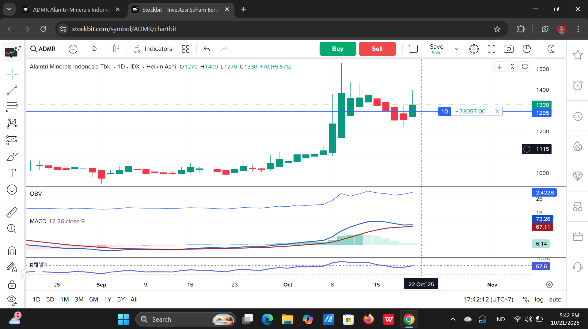 @AndreNicoMaulana betul, resist kuatnya saat ini di 1400. meskipun hari ini sempat menyentuh tapi terpantau gagal breakout. semoga koreksinya dalam minggu ini tidak terlalu dalam, analisa daily menunjukkan harga saat ini masih di atas MA(5,10,20,50,100,200), sesuai MACD juga masih bullish, support untuk harga saat ini di kisaran 1320-1330, jika breakout bisa turun ke support kuatnya di 1250 @afryan123 $ADMR