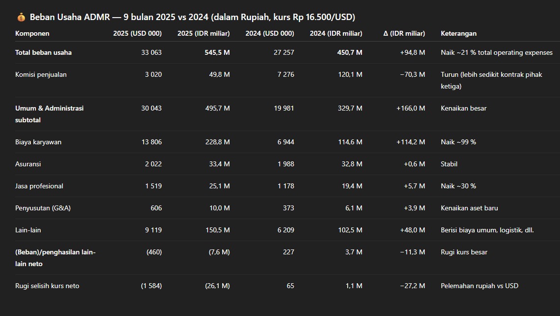 sedikit catatan LK Q3 2025 $ADMR, seusai proyeksi, laba Q3 2025 only 1 T lebih sdikit (konservatif), mungkin menjelang tutupan Q4 2025 akan sedikit rebound harga metcoal cenderung stabil, dg mulai beroperasi smelter KAI, sudah terefleksi ke beban di Q3