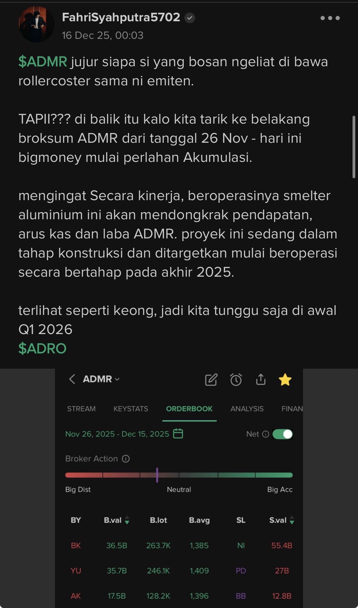maka dari itu gw setelah analisa panjang fundamental $ADMR jadi jatuh cinta banget sama ini emiten, lagi peresmian smelter di akhir tahun harganya sudah naik tinggi😁