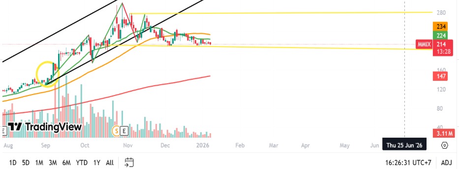 Kondisi $MMIX saat ini bisa dibilang, berada dekat di support terdekatnya (214)