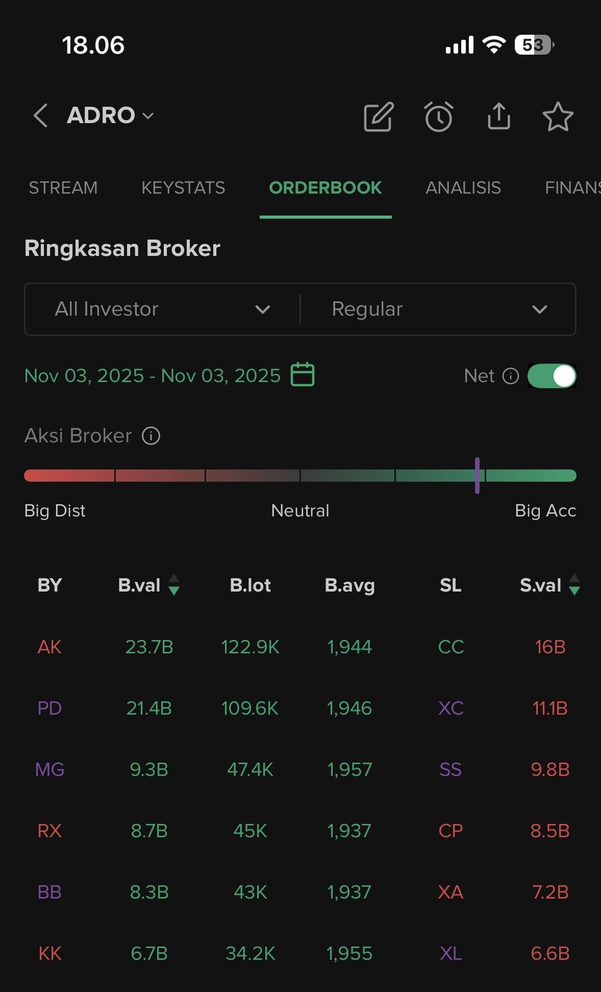$ADRO hari ini terlihat sudah berhasil untuk bisa rebound n Kembali naik dengan cukup solid n signifikan hingga saat ini ADRO berada diangka 1940 setelah sebelumnya ADRO ini mengalami koreksi cukup dalam hingga angka 1885, tepat dikisaran MA-5nya dimana menariknya dari rebound ADRO hari ini ialah terlihat di broksumnya overall ada akumulasi yang terjadi yang banyak dilakukan oleh Pihak Foreign seperti oleh broker AK sehingga membuat viewnya jadi cukup menarik saat ini.