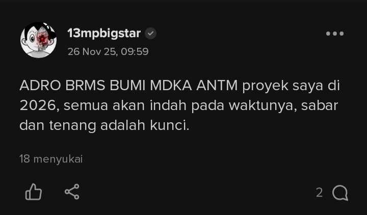 @aguskim saya tetap berpendapat krn proyek $ADRO belum mulai jalan semua shg gak ada narasi untuk menggoreng dan minim pemberitaan. Trus periode ini masih periode buyback shg harga masih ditekan PSP untuk mendapatkan harga murah ketika dana siap. Apapun yg terjadi $ADRO tetap jadi corestock saya krn kinerjanya dan semua akhirnya akan kembali ke fundamental apapun narasinya.