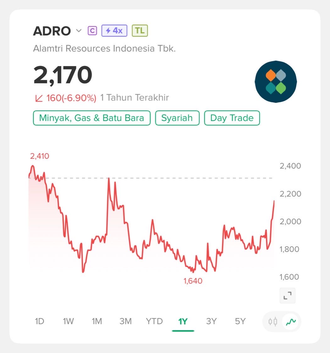 $ADRO merepresentasikan fase transisi sektor energi, di mana kekuatan bisnis batu bara yang masih menghasilkan arus kas besar mulai diseimbangkan dengan arah diversifikasi dan keberlanjutan, sehingga pergerakannya sering dibaca pasar sebagai cerminan ekspektasi jangka menengah antara komoditas dan kesiapan menghadapi perubahan struktur energi global.