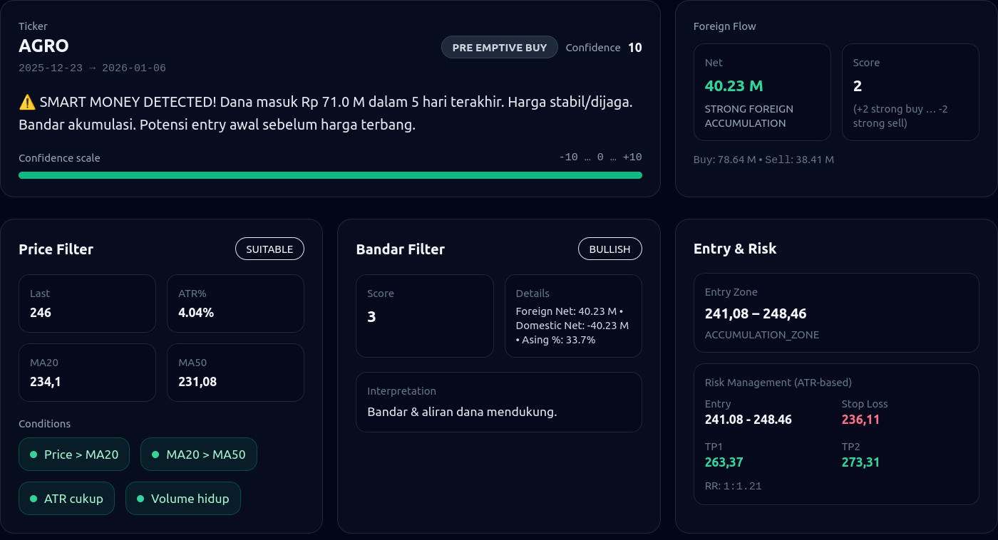 ā ļø SMART MONEY DETECTED! Dana masuk Rp 71.0 M dalam 5 hari terakhir. Harga stabil/dijaga. Bandar akumulasi. Potensi entry awal sebelum harga terbang.