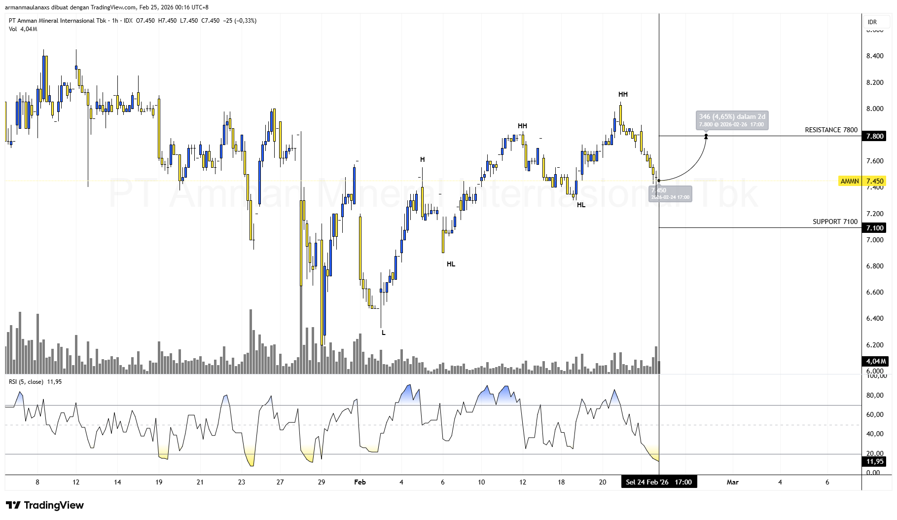 Trading Plan PT Amman Mineral Internasional Tbk ($AMMN) – 1H: Harga terkoreksi ke area 7.450 setelah membentuk struktur higher high, dengan support kuat di 7.100 sebagai level invalidasi; selama bertahan di atas area tersebut, peluang rebound menuju resistance 7.800 (potensi ±4–5%) masih terbuka. RSI(5) ~11 menunjukkan kondisi sangat oversold sehingga rawan technical bounce jangka pendek. Entry spekulatif dapat dipertimbangkan di area 7.300–7.500 dengan stop loss di bawah 7.100; skenario utama adalah pullback sehat dalam struktur uptrend.